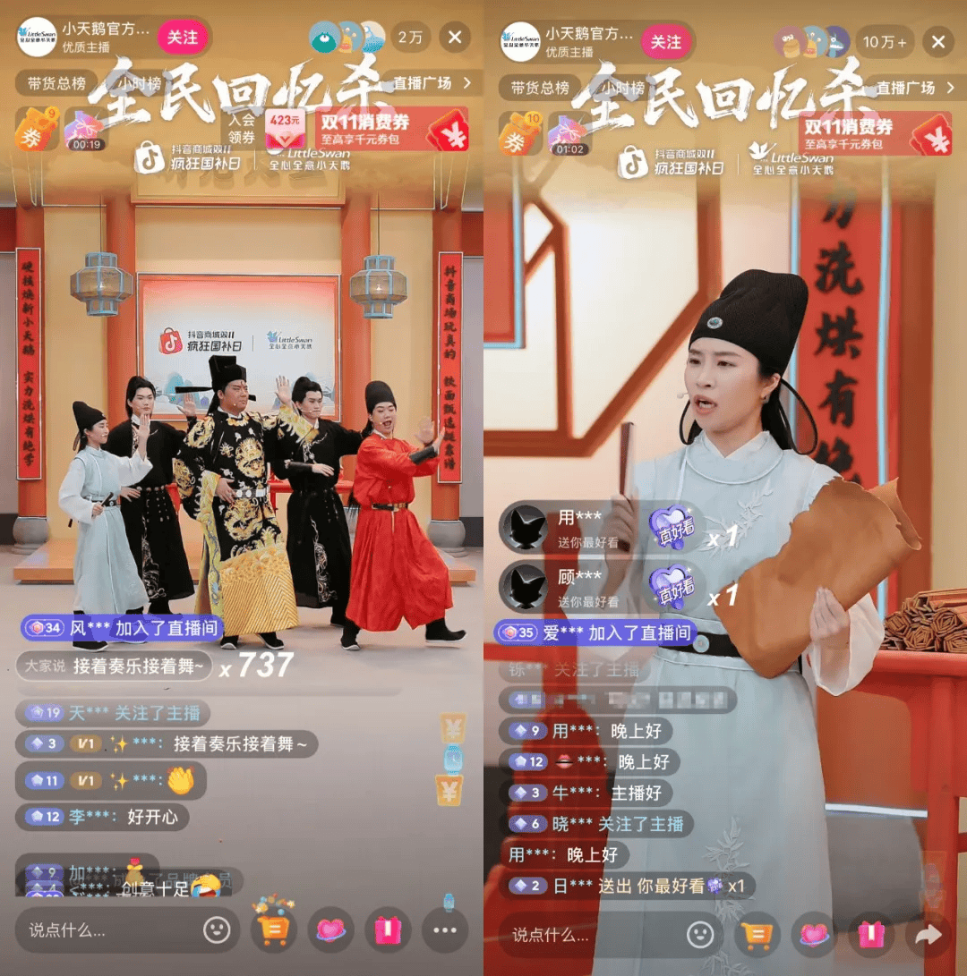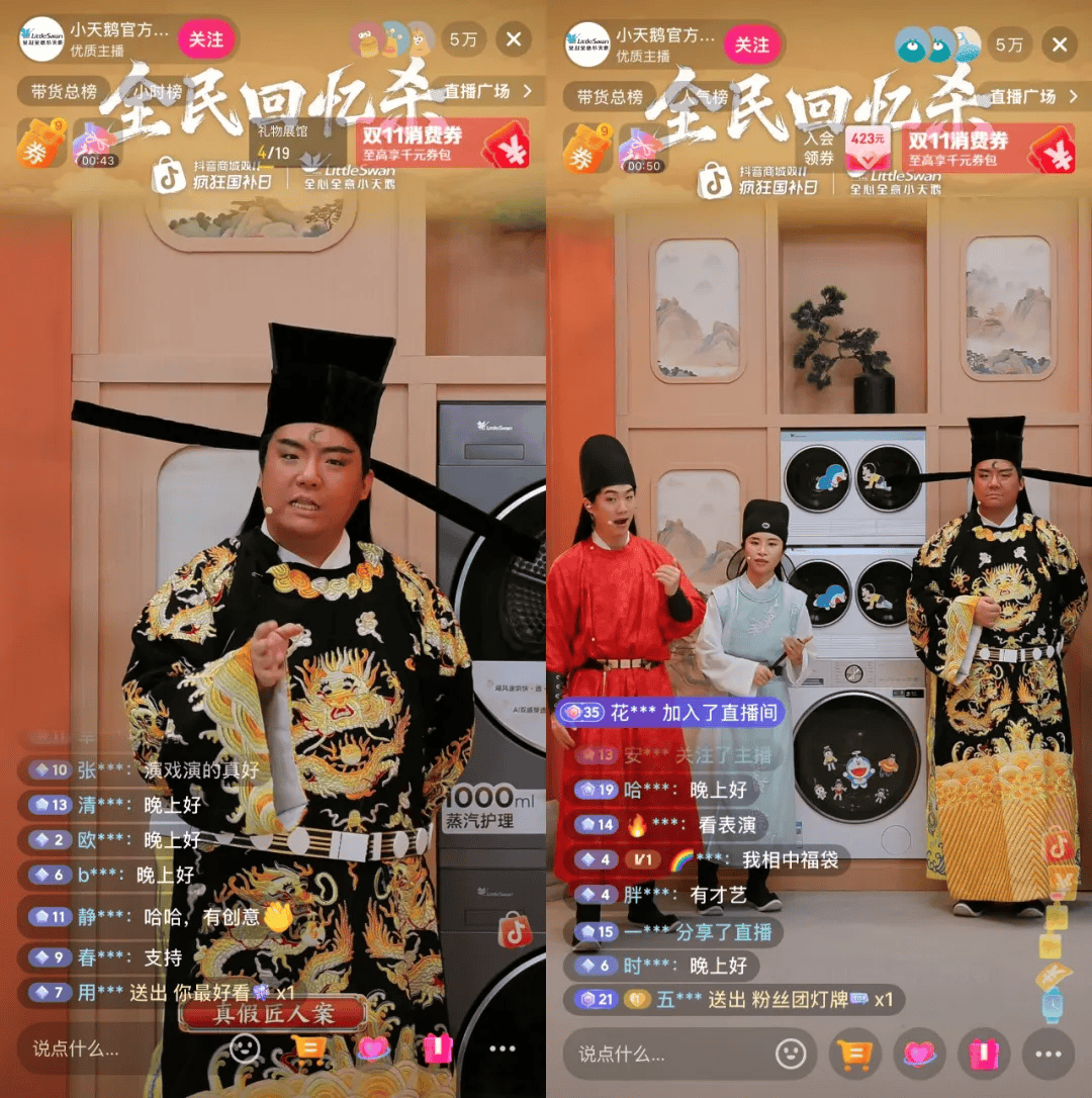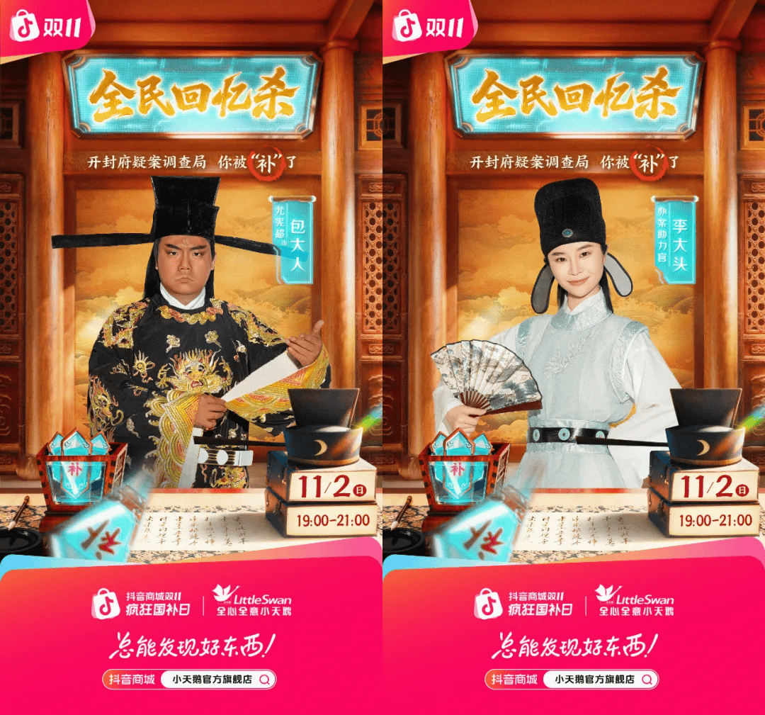 这场名为《开封府疑案调查局· 你被“补”了》的主题直播,是抖音商城「全民回忆杀」IP携手国民品牌小天鹅在双11期间共创的一场直播内容事件。